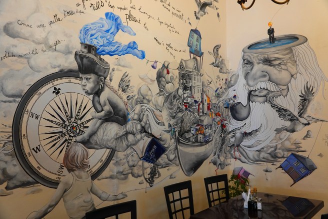 The waiter explained to me that the art in this restaurant was painted by two art students, one a French female whose mind boggling talent you are looking at now. (Please click to enlarge).