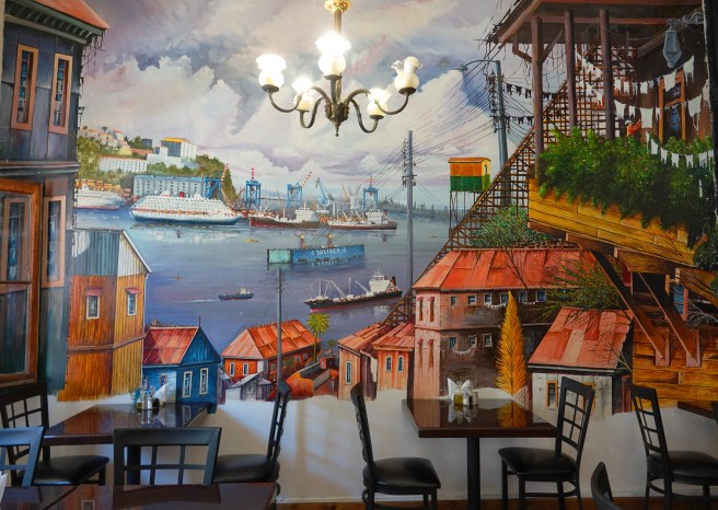 The first two paintings of the café sign and the entry door were done by the Chilean student, and are depictions of Valparaiso…