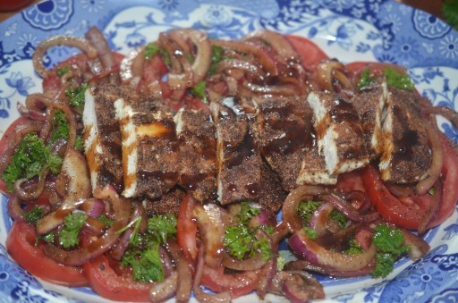 All I can say is you have to make this sumac-pomegranate flavored recipe while the tomatoes are perfectly ripe (at least here in Michigan). The spiced onions are heavenly and the chicken is tender and goes perfectly in this Palestinian recipe. It is a take on a dish called musakhan, which is chicken seasoned with tangy, deep red sumac which has a hint of lemon. Serve with some flat bread of your choice – I had some Naan on hand.