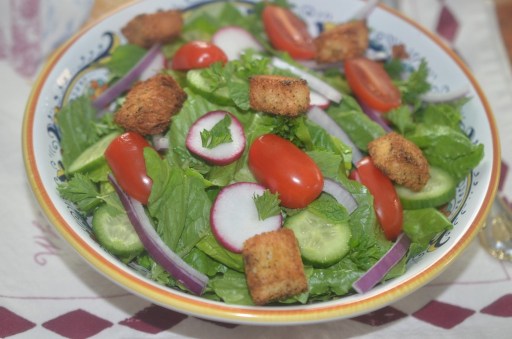 I recently learned that many cookbooks on Mediterranean cuisine have a recipe for Fattoush salad – I didn’t know it was so popular. It is a Levantine salad made from toasted (which I prefer) or fried pieces of Arabic flatbread which includes pita bread. In one of my cookbooks (Dada Eats Love to Cook It: 100 Plant Based Recipes for Everyone at Your Table) she made sourdough croutons replacing the traditional pita chips. I liked these a lot maybe because they were spiced with za’atar. She also added pomegranate arials which noone else did – I enjoyed them.
