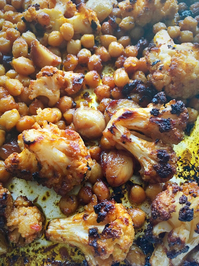 This is one of my all time favourite dishes of mine, the flavours are phenomenal and the textures are perfect, the crunchy bits on the cauliflower, and the sticky cloves of garlic and the pop of the chickpeas…I can wax lyrical about this one for hours….!